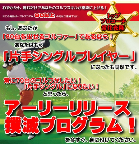 アーリーリリース撲滅プログラムは、ダウンスイングからインパクトにかけてコックがほどけてしまうというアーリーリリースを解消することで片手シングルを目指すレッスンです。